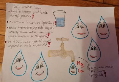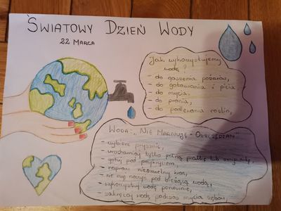 Chętne dzieci wykonały plakat pod tytułem „Jak oszczędzać wodę?” i przyniosły w poniedziałek 28.03.2022. Otrzymały nagrodę: dyplom i pochwałę w dzienniku elektronicznym. W kolejne dni Dzieci otrzymały ulotki z okazji „Światowego Dnia Wody z PAH”. Odbyły się lekcje tematyczne na zajęciach z wychowawcą oraz zajęciach z kreatywności (kółko historyczne). Głównym celem zajęć było zwrócenie uwagi na oszczędzanie wody przez każdego z nas. Uczniowie byli aktywni, wykazywali się kreatywnością, pomysłowością pracując z kartami pracy. W nagrodę otrzymali odznakę „EKSPERTA OD WODY”. Chętni uczniowie przynosili do picia wodę mineralną niegazowaną zamiast kolorowych, słodzonych napojów. Dzięki zdobytej wiedzy uczniowie będą mądrze korzystać z wody, która jest bardzo cenna.