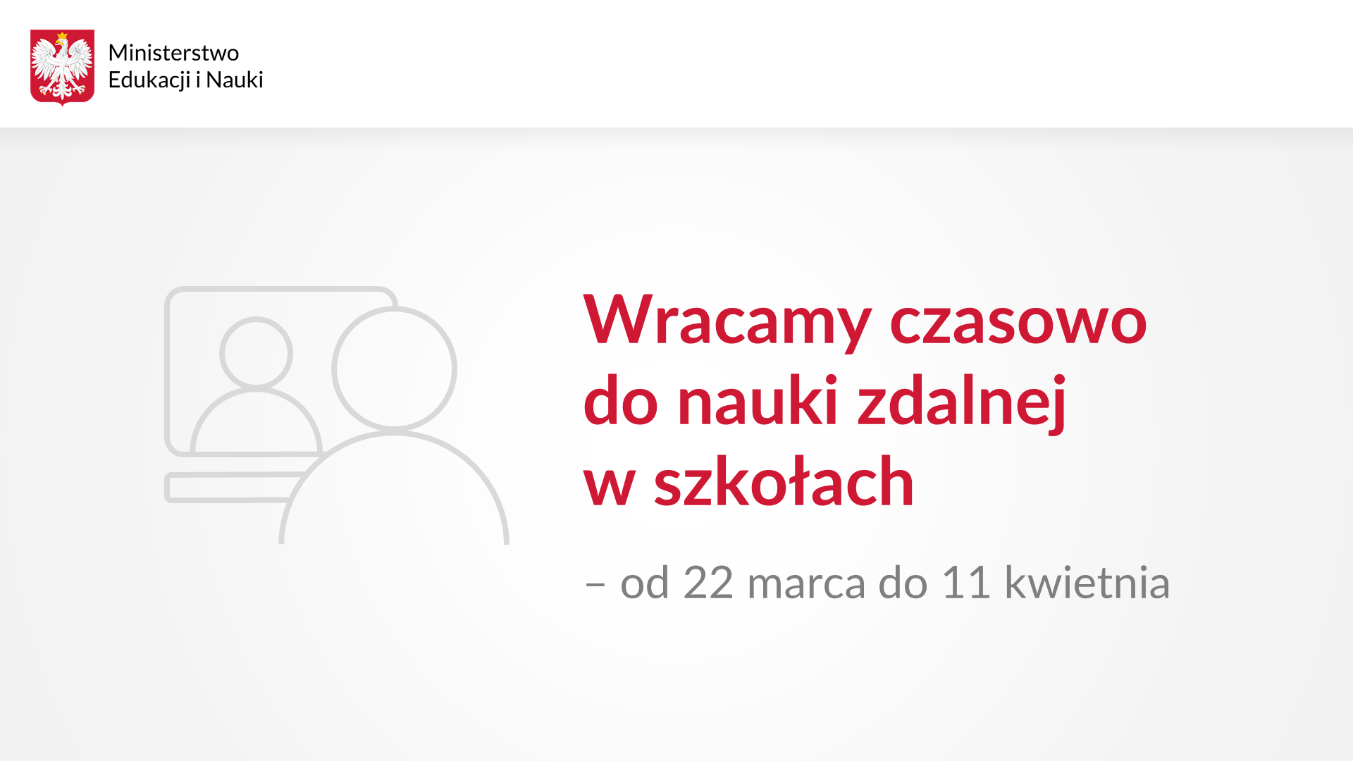 Na podstawie Rozporządzenia Ministra Edukacji i Nauki z dnia 18 marca 2021 r. zmieniające rozporządzenie w sprawie czasowego ograniczenia funkcjonowania jednostek systemu oświaty w związku z zapobieganiem, przeciwdziałaniem i zwalczaniem COVID-19 od poniedziałku 22 marca do 11 kwietnia naukę w trybie zdalnym będą realizowali uczniowie klas I-III.