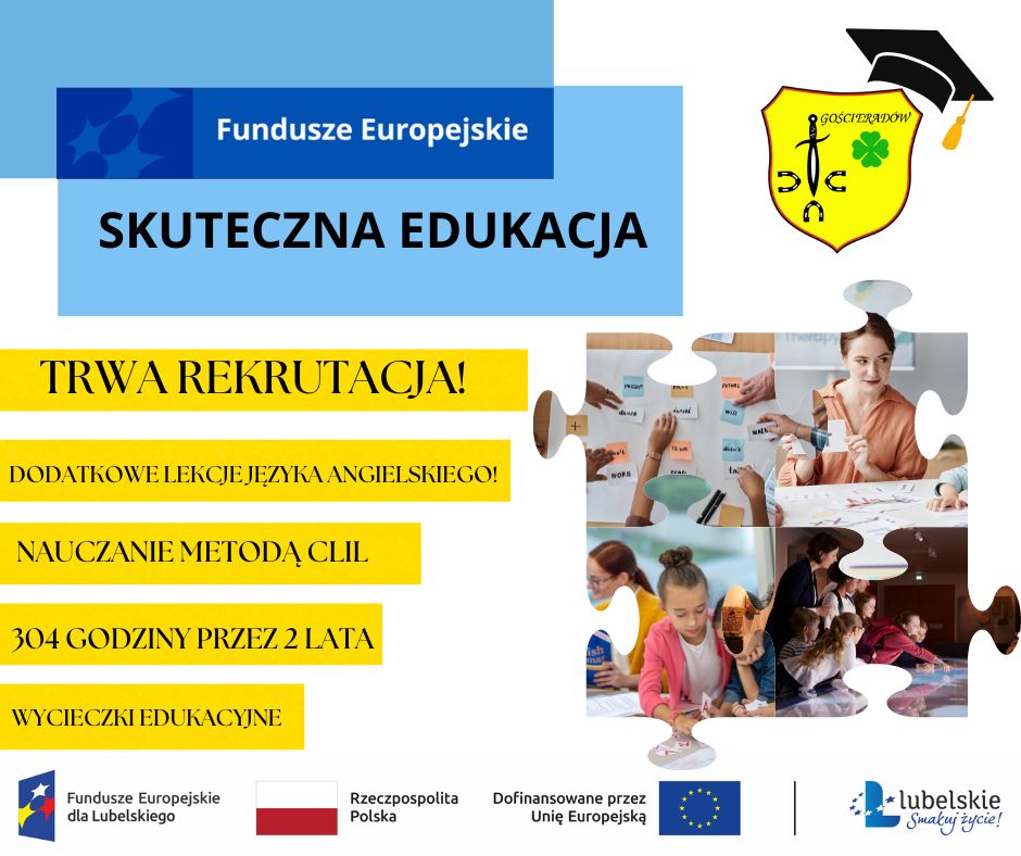 Gmina Gościeradów rozpoczyna realizację projektu z dotacji z Unii Europejskiej „Skuteczna edukacja” w ramach programu Fundusze Europejskie dla Lubelskiego 2021-2027. Priorytet X Lepsza edukacja, Działanie 10.1 Skuteczna edukacja, współfinansowanego ze środków Europejskiego Funduszu Społecznego Plus.