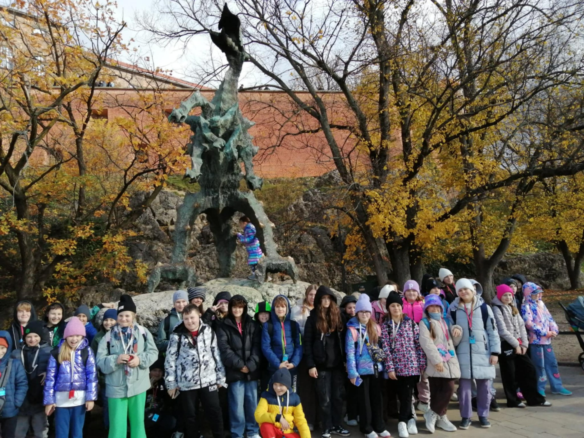28 października uczniowie klas czwartych i piątych naszej szkoły, którzy uczestniczą w projekcie Skuteczna Edukacja, odwiedzili królewski gród Kraka. Historyczna stolica Polski przywitała wycieczkowiczów wietrzną i słoneczną pogodą. W Krakowie dzieci odwiedziły smoka, Wzgórze Wawelskie z dawną siedzibą polskich królów, na Rynku posłuchały hejnału i zwiedziły Sukiennice oraz obejrzały wystawę malarstwa w Muzeum Narodowym. Wizyta w jesiennym Krakowie była piękną przygodą.