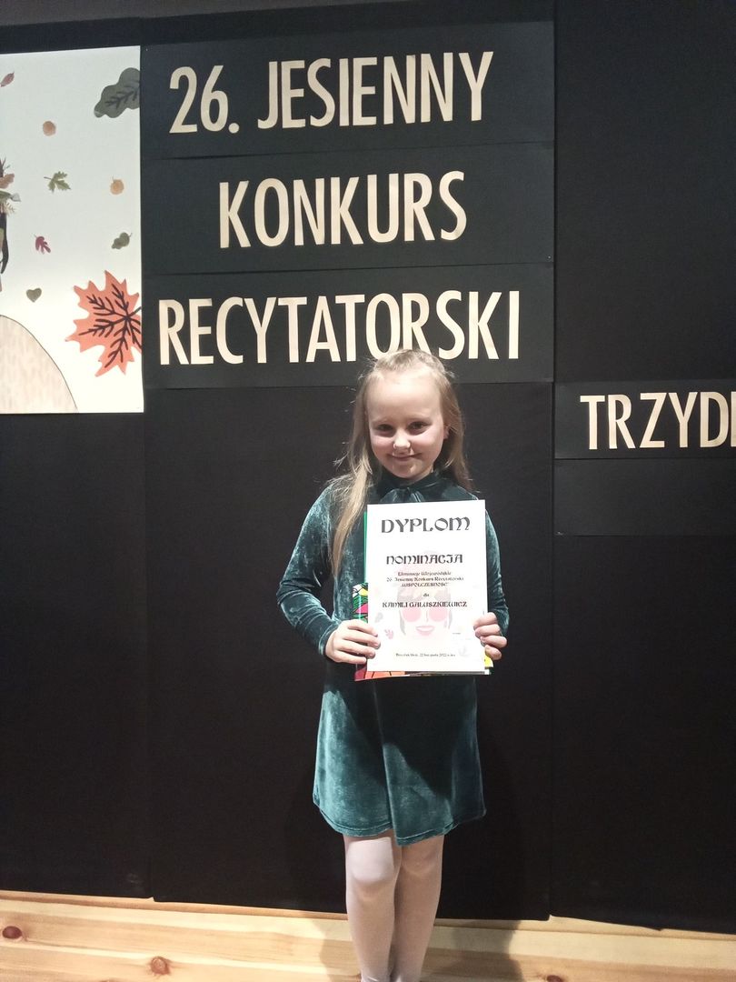 Kamila Gałuszkiewicz z klasy III A została laureatką 26. Konkursu Recytatorskiego "Współczesność", który odbył się 22 listopada 2022 roku w Trzydniku Dużym. Kamilka otrzymała nominację do etapu wojewódzkiego, w którym będzie reprezentowała naszą szkołę.