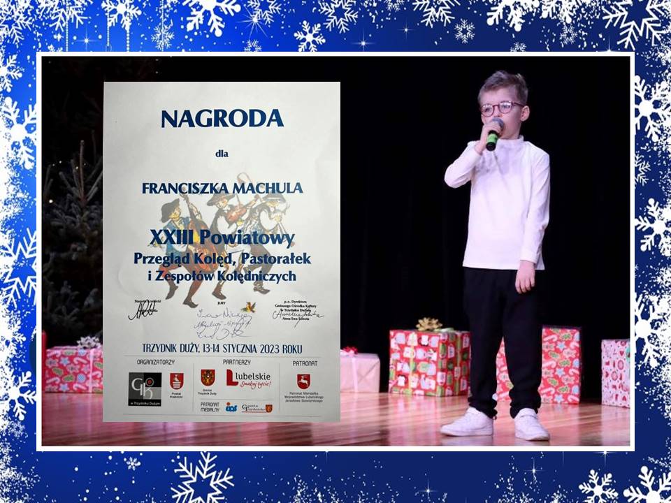 Uczeń klasy II „b” Franciszek Machul zdobył NAGRODĘ w Kategorii Solista w XXIII Powiatowym Przeglądzie Kolęd, Pastorałek i Zespołów Kolędniczych zorganizowanym przez Gminny Ośrodek Kultury w Trzydniku Dużym.