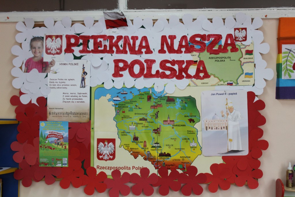 W RAMACH REALIZACJI MIEDZYNARODOWEGO PROJEKTU "PIĘKNA NASZA POLSKA CAŁA" W NASZYM PRZEDSZKOLU ZOSTAŁY WYKONANE PIERWSZE GAZETKI OKOLICZNOŚCIOWE I ODBYŁY SIĘ ZAJĘCIA NAWIĄZUJĄCE DO TEMATU PROJEKTU.