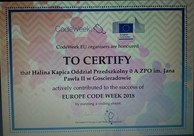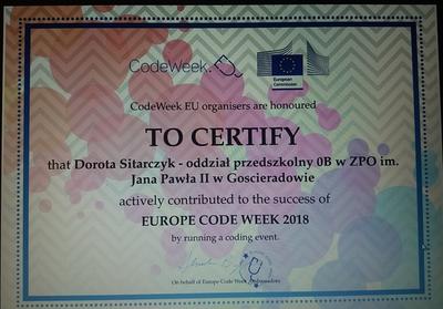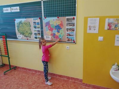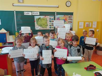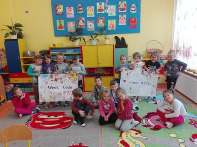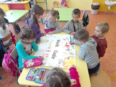 Oddziały przedszkolne 0A i 0B w tym roku po raz pierwszy wzięły udział w Europejskim Tygodniu Kodowania. Jego celem jest popularyzacja i promocja nauki programowania wśród dzieci, młodzieży i dorosłych, gdyż ta umiejętność jest niezwykle ważna dla przyszłego rynku pracy. Przez 5 dni, od 15 do 19 października dzieci wykonywały zadania związane z programowaniem i kodowaniem. Pracy było dużo, ale również dużo radości, że udało się je wykonać.Pierwszego dnia szukaliśmy na mapie Code Week naszych wydarzeń i uczyliśmy się tańca robotów. Drugiego dnia odczytywaliśmy zakodowany napis Code Week i kodowaliśmy trasę dla ozobotów. Trzeciego dnia poznawaliśmy nasze województwo. Wędrując po mapie, szukaliśmy naszej miejscowości i znanych nam miast. Potem odczytywaliśmy zakodowane wyrazy - nazwy miejscowości i zabytków, a w internecie szukaliśmy zdjęć tych zabytków. Czwartego dnia tworzyliśmy mapy naszej miejscowości z zakodowanymi trasami dla ozobotów. Piątego dnia tworzyliśmy plakaty podsumowujące naszą tygodniową pracę - dzieci wykonały je według własnych pomysłów. Europejski Tydzień Kodowania zakończył się 21 października, zachęcamy do udziału w tym wydarzeniu w przyszłym roku. D. Sitarczyk, H. Kapica