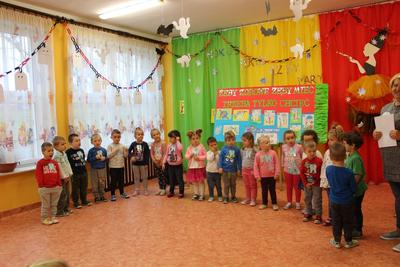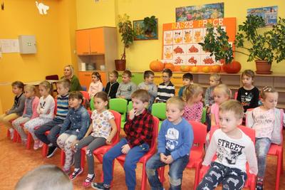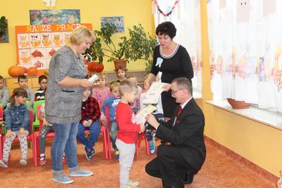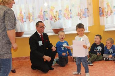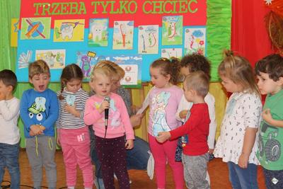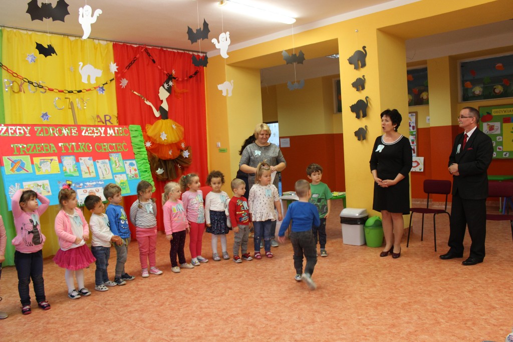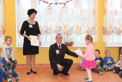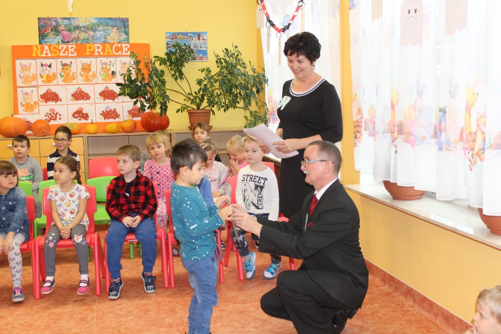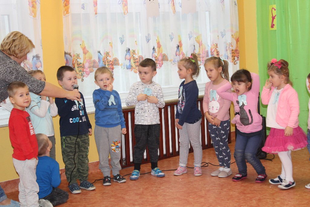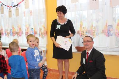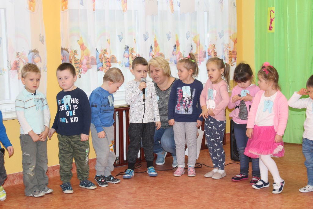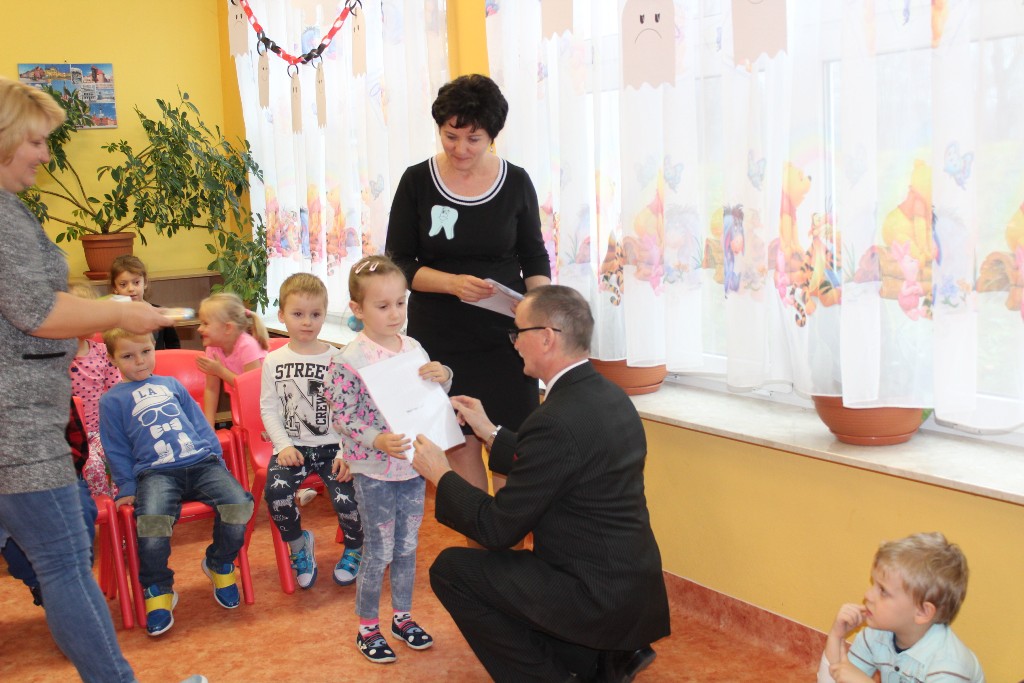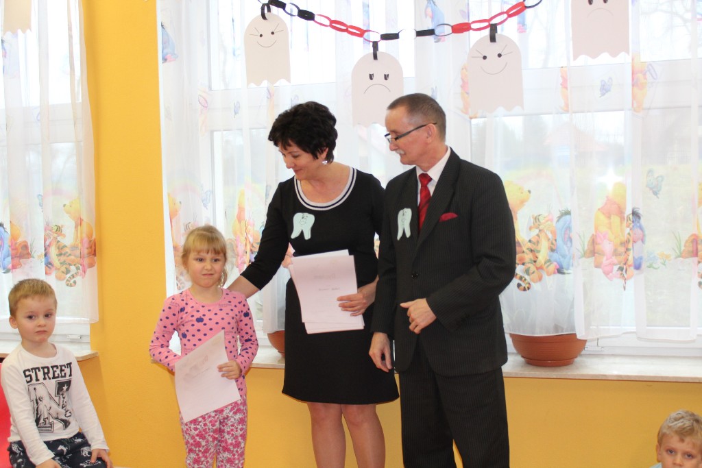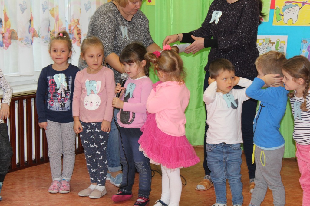 W dniu 04.12.2018r. w naszym przedszkolu miało miejsce podsumowanie projektu edukacyjnego "Żeby zdrowe zęby mieć, trzeba tylko chcieć." Dzieci z najmłodszych grup 3 i 4 - latków przygotowały krótkie przedstawienie, poprzez które utrwalone zostały najważniejsze zasady dbania o higienę jamy ustnej. Uroczystość zaszczycił swoją osobą pan Wójt Gminy Gościeradów M. Szczepanik oraz pani dyrektor B. Sajecka. Rozdane zostały również nagrody dla dzieci biorących udział w konkursie na "Przybory do higieny jamy ustnej". Wszystkie prace zostały nagrodzone.