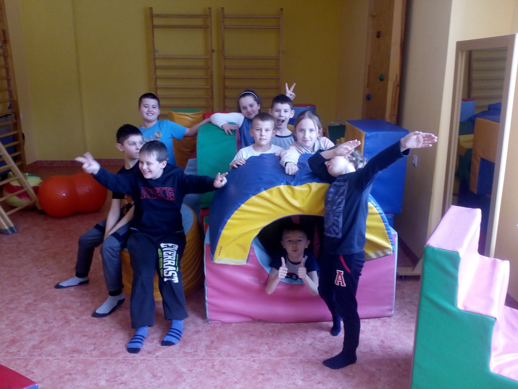 Za oknem zimno, pada śnieg a my się rozgrzewamy w sali korekcyjnej. Jest tam możliwość zabaw ruchowych oraz innych form kultury fizycznej.